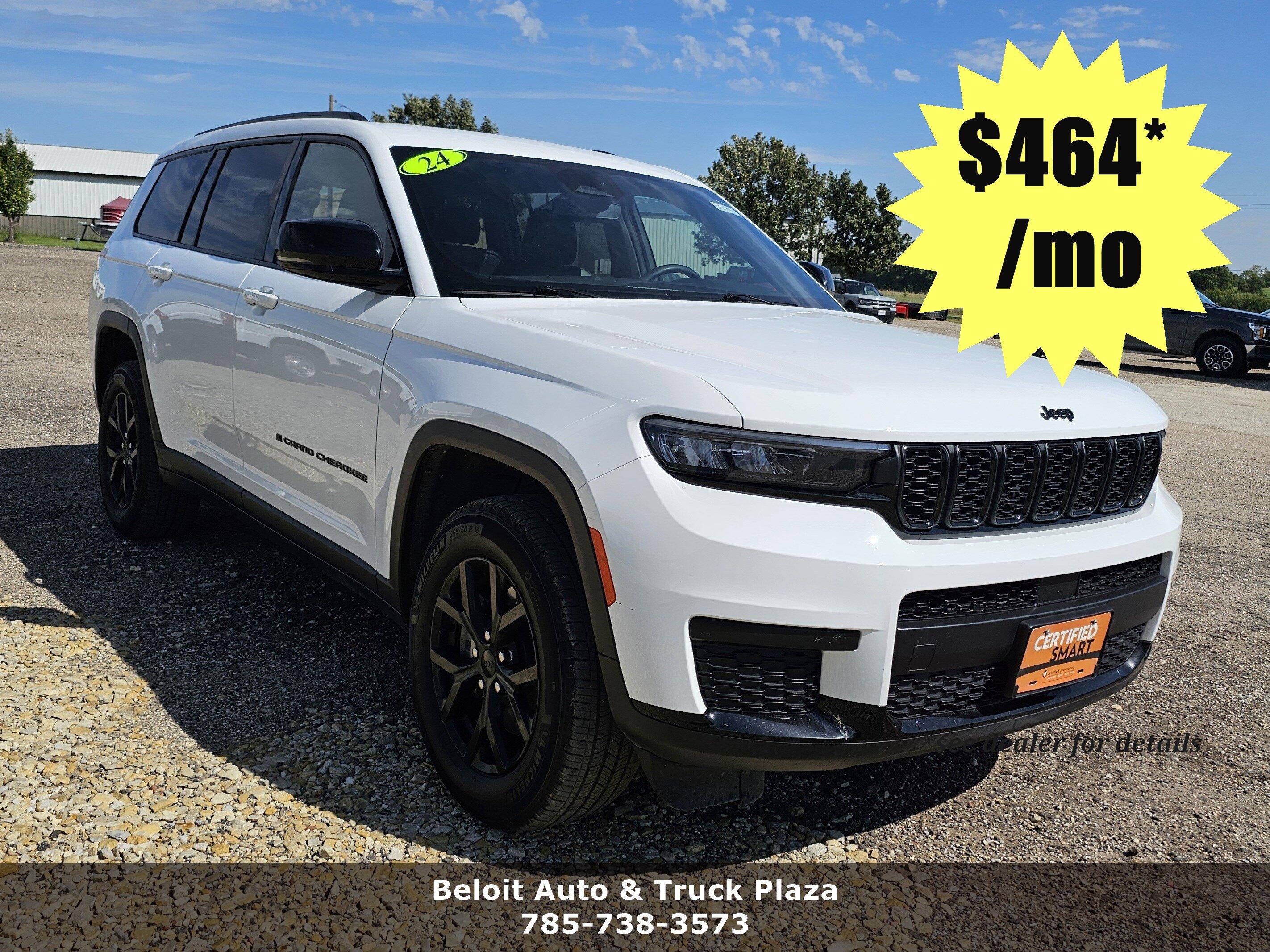 *2024 Jeep Grand Cherokee L Altitude --- Three Rows. Bold Style. Everyday Confidence.*If you're looking for a *stylish three-row SUV* that blends comfort, capability, and modern design, this *2024 Jeep Grand Cherokee L Altitude* delivers---and it's ready for you *right now*.Powered by a proven *3.6L V6 engine* paired with an *8-Speed Automatic Transmission*, this Grand Cherokee L offers smooth performance while still achieving an impressive *25 MPG Highway and 18 MPG City*. It's built for busy family life, long road trips, and everything in between.*Performance & Efficiency:* * *3.6L V6 24V VVT Engine with ESS* * *8-Speed Automatic Transmission (8HP50)* * Driver-Selectable Drive Modes * Selectable Tire Fill Alert*Altitude Style Package:* * *18 Fully Painted Aluminum Wheels* * *Bright White Clearcoat* with Gloss Black Exterior Accents * Black Headliner for a modern, upscale look*Comfort & Convenience Features:* * *Heated Front Seats & Heated Steering Wheel* * Remote Start System * Power Liftgate * Wireless Charging Pad * Rain-Sensitive Windshield Wipers*Premium Interior & Space:* * *Global Black Capri Leatherette/Suede Seats* * *7-Passenger Seating* with 2nd-Row 60/40 Tip-and-Slide Bench * 3rd-Row USB Charging Ports * Dual-Zone Automatic Climate Control * 115V Auxiliary Power Outlet*Three-row SUVs with this level of style and features don't last long.*If you've been waiting for the right Grand Cherokee L, *this Altitude is it*.*Stop by today* at *Beloit Auto and Truck Plaza*,*3133 US Hwy 24, Beloit, KS 67420*.*Live a little---make this must-own 2024 Jeep Grand Cherokee L Altitude yours today!**Call Today 785-738-3573*